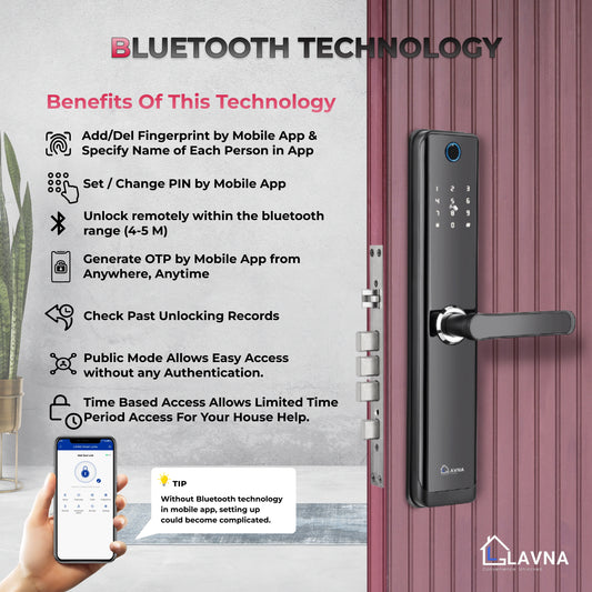 LAVNA LA24 Smart Door Lock with Bluetooth Mobile App, Fingerprint, OTP, PIN, RFID Card & Manual Key
